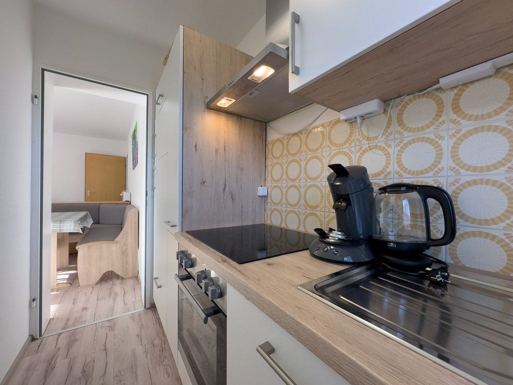 Die lichtdurchflutete F...Weiterlesenerienwohnung befindet sich im 2. Stock und ist geschmackvoll eingerichtet. Das Herzstück der Wohnung bildet das einladende Wohnzimmer mit einer bequemen Sofaecke, die zu entspannten Abenden einlädt. Hier finden Sie auch einen TV für unterhaltsame Filmabende. Der Essbereich mit einem großen Tisch ist ideal für gesellige Mahlzeiten, die Sie bequem in der voll ausgestatteten, geschlossenen Küche zubereiten können. Diese Küche lässt keine Wünsche offen: Sie verfügt über einen 4-Platten-Herd, einen Elektro-Backofen, einen Kühlschrank mit Gefrierfach, und alle nötigen Küchenutensilien, einschließlich einer Kaffeemaschine. Damit sind Sie bestens gerüstet, um Ihre Lieblingsgerichte zuzubereiten oder regionale Spezialitäten zu genießen.