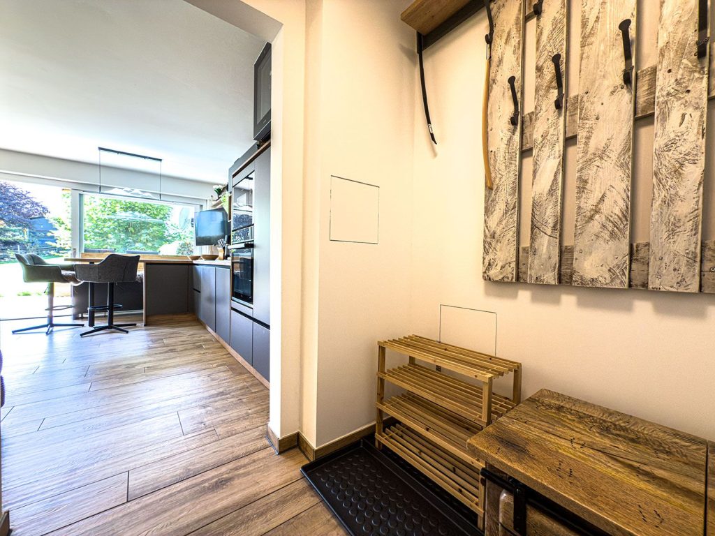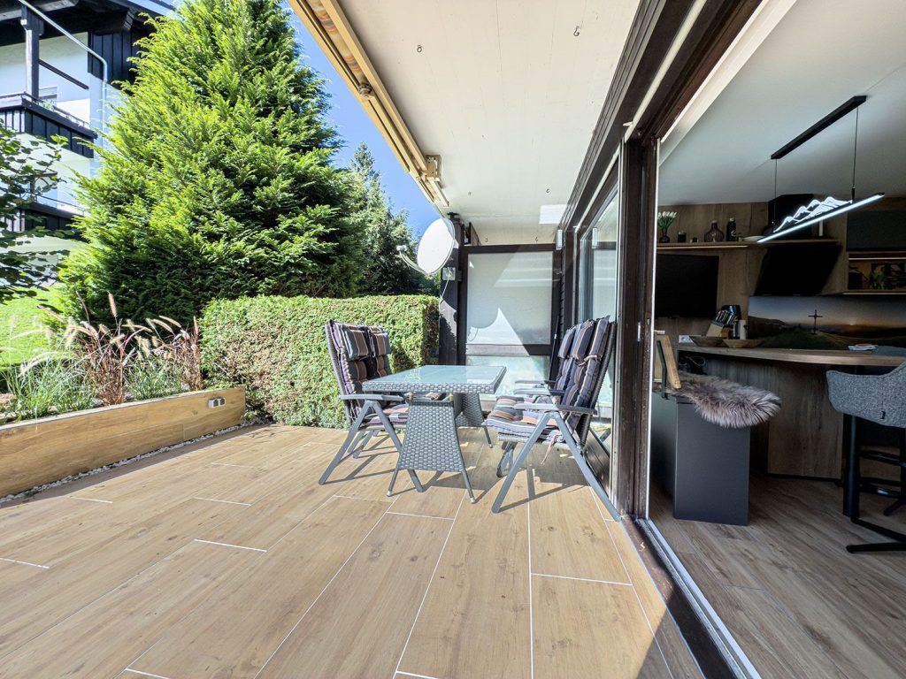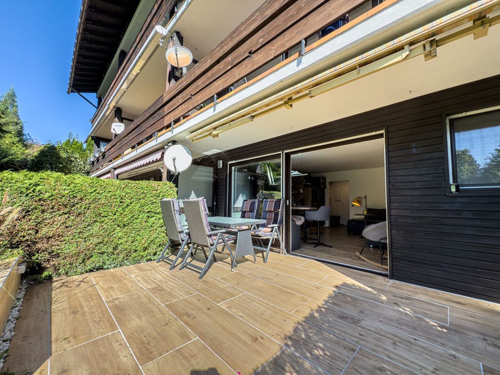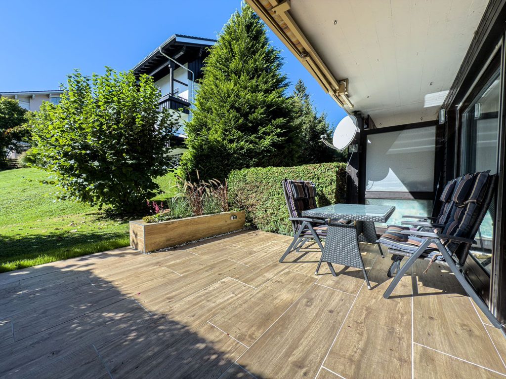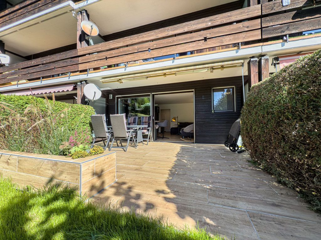 Der lichtdurchflutete Wohnbereich ist offen zur modernen Küche gestaltet und bietet mit einer gemütlichen Sofaecke sowie zwei TV´s ideale Bedingungen für entspannte Stunden. Für gemeinsame Mahlzeiten steht Ihnen ein großer Essbereich mit Esstisch zur Verfügung. Die großzügigen Fenster sind mit Sichtschutz ausgestattet und ermöglichen einen herrlichen Gartenblick. Über die bodengleiche Tür gelangen Sie auf den überdachten Balkon, der in eine private Terrasse mit komfortablen Gartenmöbeln und Sonnenliegen übergeht. Hier finden Sie eine Liegewiese, die zum Verweilen in ruhiger Umgebung einlädt.