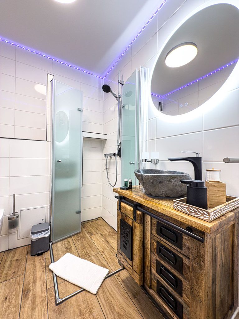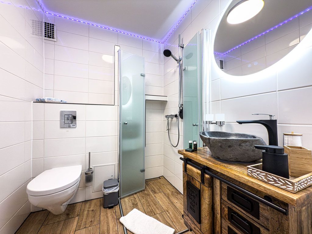 Das Schlafzimmer ist behaglich eingerichtet und bietet ausreichend Stauraum durch eine Kommode und eine Garderobe. Die Wohnung stellt vier Schlafmöglichkeiten bereit und gewährleistet erholsamen Schlafkomfort. Das moderne Badezimmer verfügt über eine bodengleiche Dusche, Waschbecken, Spiegel, WC und ist mit Hand- sowie Badetüchern ausgestattet.