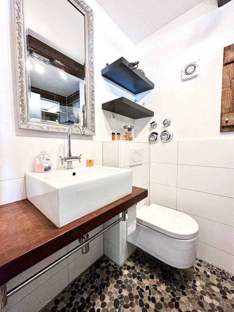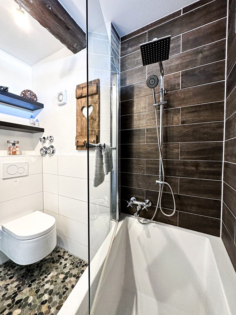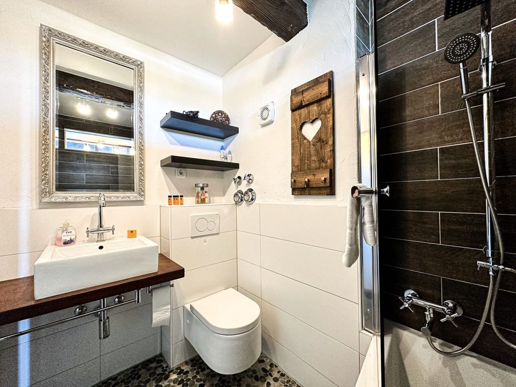 Das Badezimmer verfügt über eine Kombination aus Dusche und Badewanne, ein Waschbecken, einen Spiegel sowie ein WC. Sämtliches Badtextil ist in der Buchung inbegriffen. Für Unterhaltung sorgt ein Fernseher mit einer Größe von 25-34 Zoll.