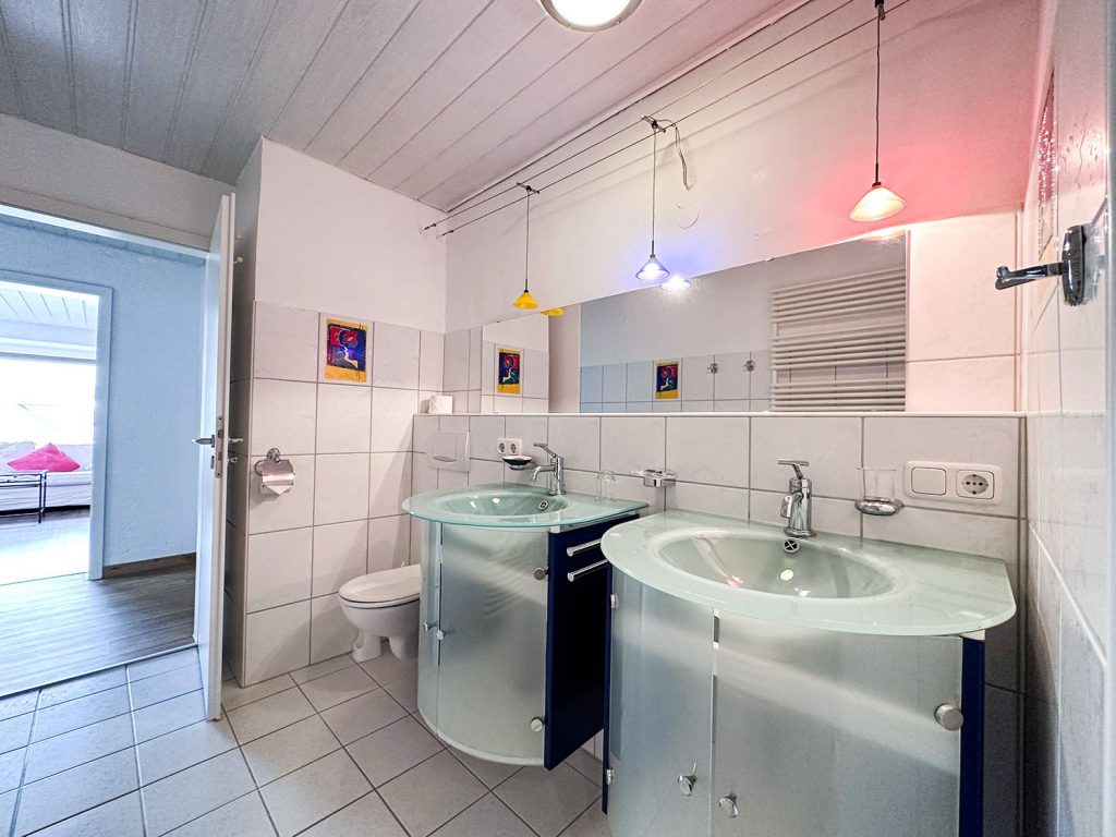 Die Küche der Ferienwohnung Giebelblick A ist mit Herd, Kühlschrank, Spülmaschine, Kaffeemaschine, Toaster und Wasserkocher sowie den üblichen Küchenutensilien ausgestattet. Mit WC, bodengleicher Dusche und Badewanne lässt auch das Badezimmer keine Wünsche offen. Internet, WLAN und TV sind ebenfalls vorhanden.