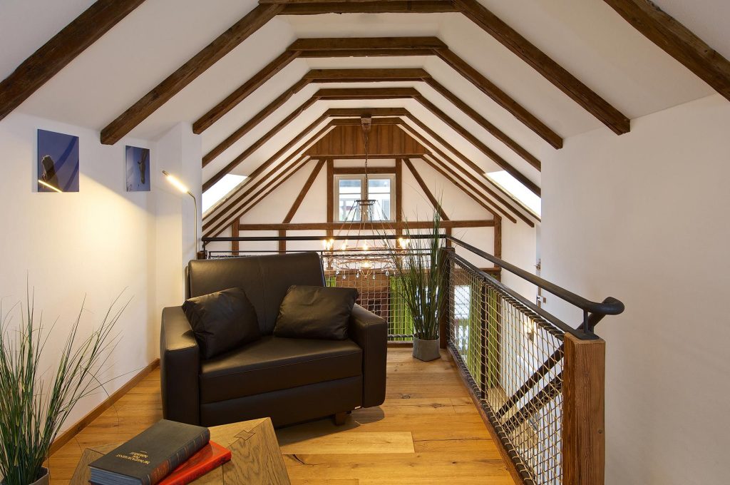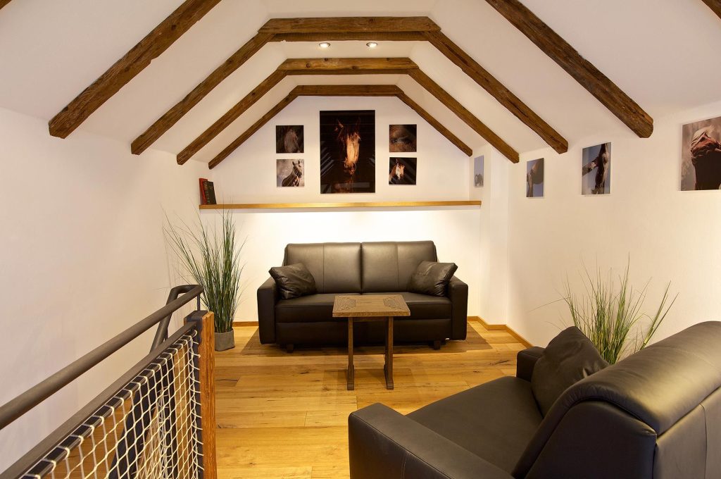 Eine Treppe höher erwartet Sie ein Aha-Erlebnis: die Galerie mit Ledersofa, Ledersessel und Blick auf den noblen Wohn-Essbereich. Dorthin können Sie sich zum Lesen zurückziehen. Außerdem lockt die Galerie mit angenehmen Schlafmöglichkeiten für drei Gäste. Ziehen Sie einfach den Ledersessel oder das Ledersofa aus und betten Sie sich komfortabel!