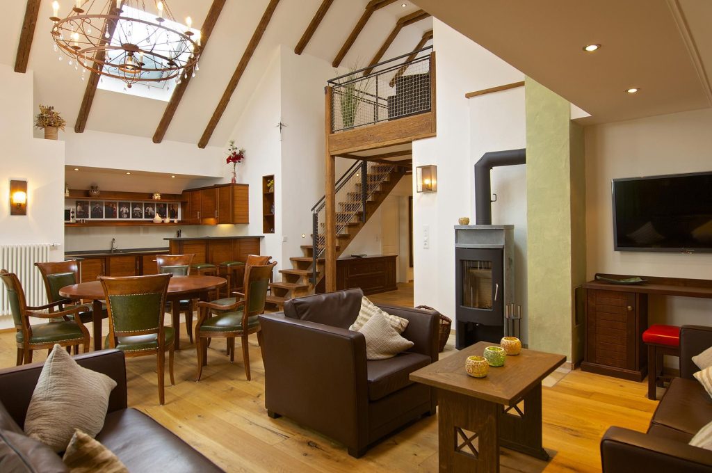 Das Herzstück der Ferienwohnung in Oberstaufen ist der luxuriöse Wohn- und Essbereich mit einer fast fünf Meter hohen Decke, in deren Mitte ein pompöser Kronleuchter hängt. Hier können Sie sich am Tisch zum Essen versammeln oder in der Ledersofaecke entspannen und einen Blick auf den Kaminofen und den drehbaren Flachbild-Fernseher genießen. Selbstverständlich liegt für die erste Ofenfüllung trockenes Buchenholz für Sie bereit.