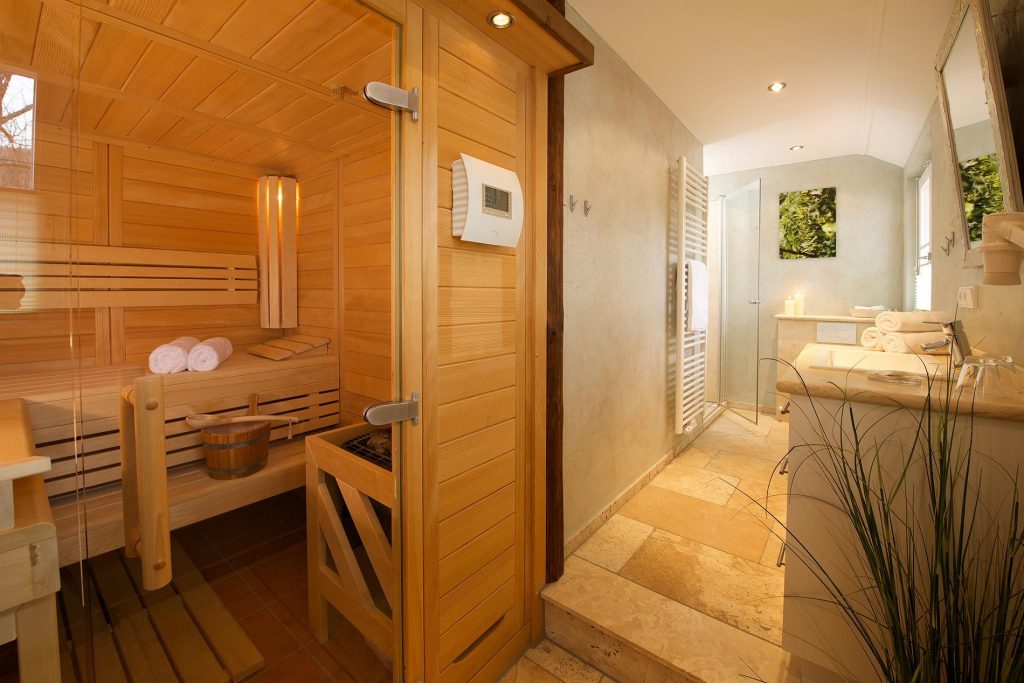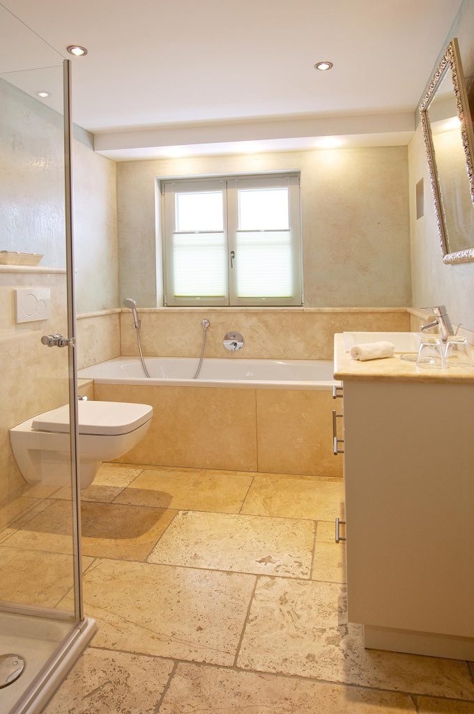 Badezimmer Nummer eins ist in Naturstein gehalten und verfügt über einen edlen Waschtisch, eine Dusche, ein WC, ein Bidet, einen Handtuchwärmer und einen Fön. Im Sommer wie im Winter ist die Sauna ein besonderes Schmankerl für Wellness-Momente. Im zweiten Badezimmer gibt es neben dem Waschtisch und der Dusche eine Badewanne - ein Handtuchwärmer und ein Fön sind ebenfalls vorhanden. Nicht fehlen darf ein separater Haushaltsraum mit Waschmaschine und Trockner.