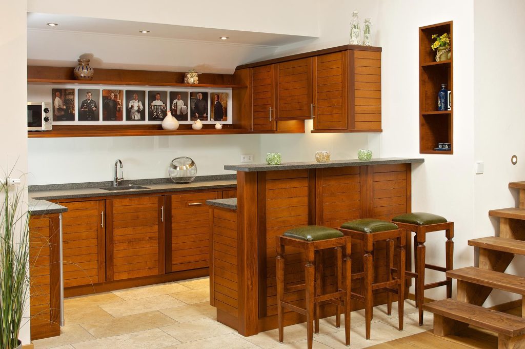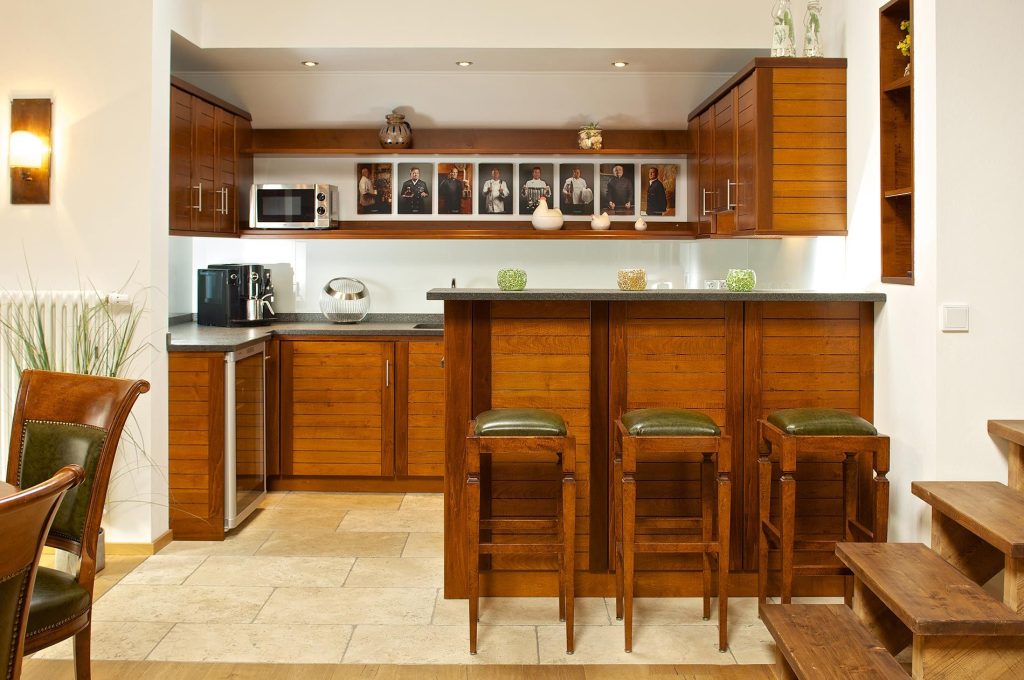 Die offen gestaltete Wohnküche enthält alles, was eine moderne Küche bieten sollte. Dazu gehören eine Mikrowelle, eine Kaffeemaschine, ein Weinschrank und hochwertiges WMF-Küchenzubehör. An der kleinen Bar mit Hockern haben Sie Gelegenheit, ihre Urlaubstage mit einem Drink ausklingen zu lassen.