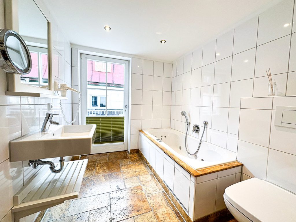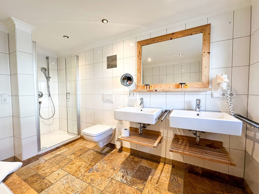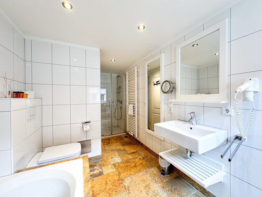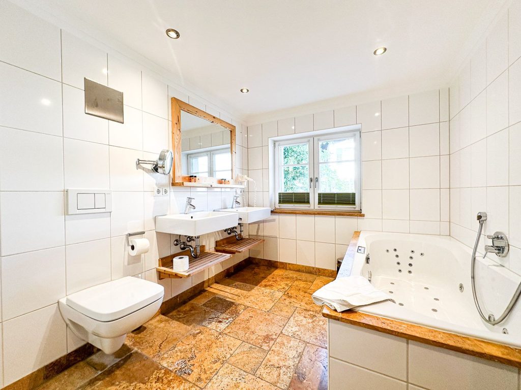 Nicht fehlen darf ein komfortables Badezimmer mit zwei Waschbecken, Dusche, einem WC und einer Badewanne. In einem separaten Haushaltsraum mit Waschmaschine und Trockner ist es möglich, Ihre Kleidung zu reinigen. Das zweite Badezimmer mit Natursteinböden entspricht modernen Wohn-Standards. Es empfängt Sie mit einer geräumigen Dusche und Badewanne, einem Waschtisch, Fön und Kosmetikspiegel. Durch die Glastür können Sie vom Bad auf den Balkon treten