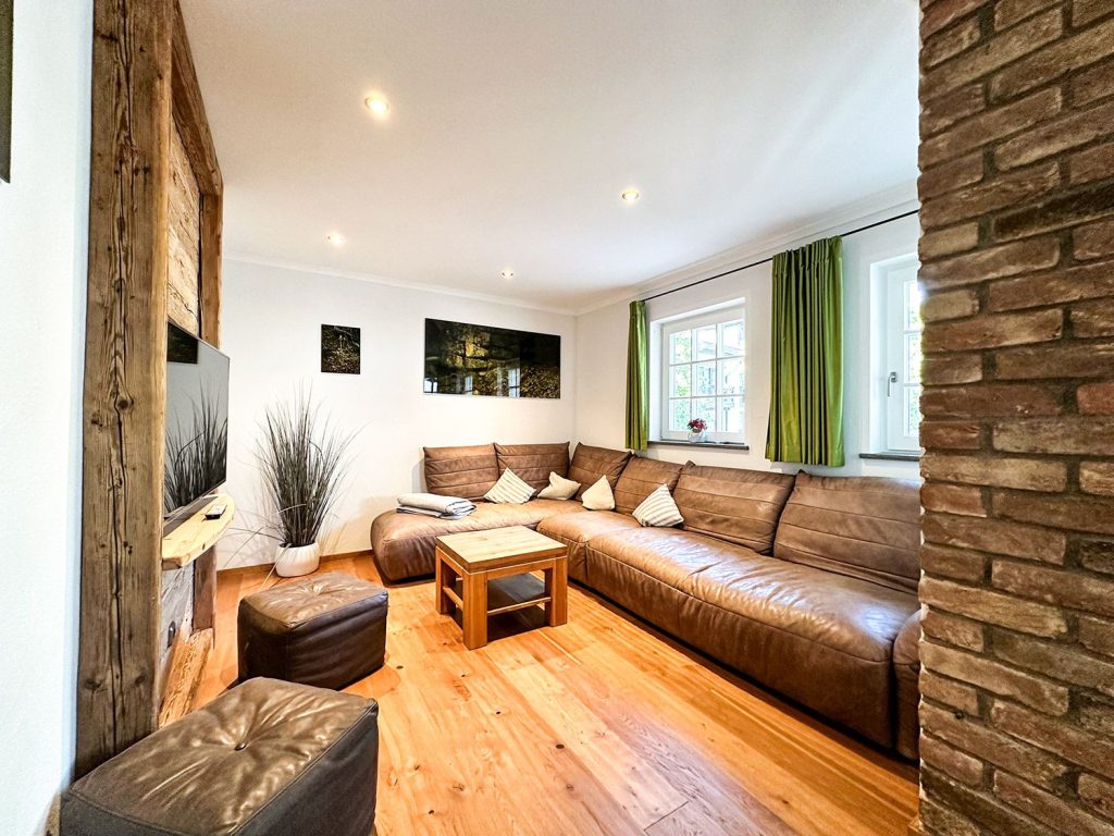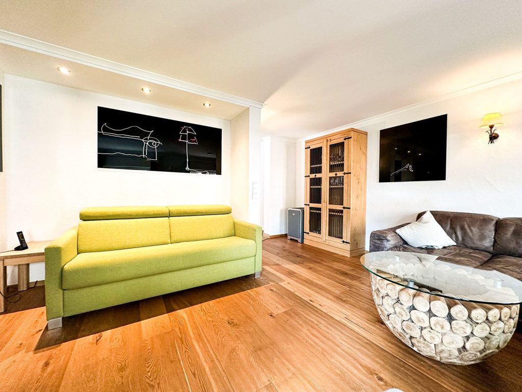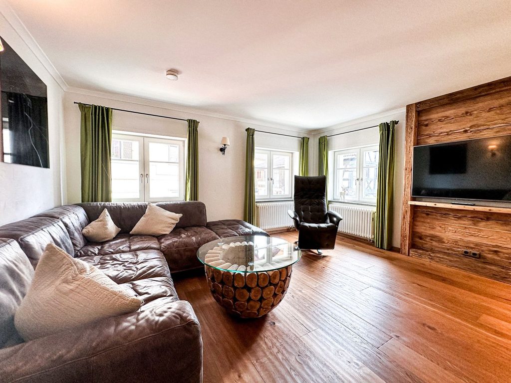 Der sich anschließende zweite Wohnbereich mit Leder-Sitzgarnitur, Relax-Ledersessel, Flat-TV und einem Ausziehsofa rundet das exklusive Ambiente dieser traumhaften Ferienwohnung in Oberstaufen ab. Das Ausziehsofa ist so konzipiert, dass zwei Gäste darauf schlafen können.