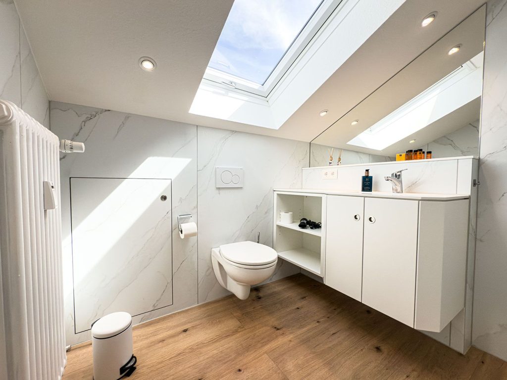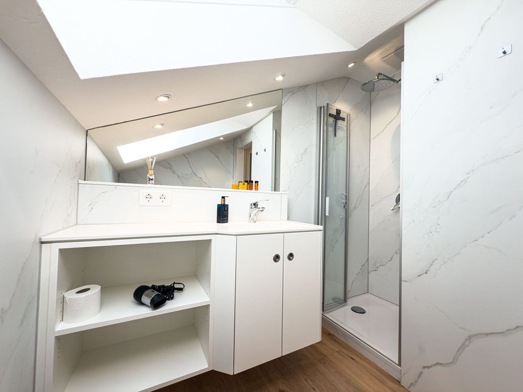 Das Badezimmer ist mit einer Dusche, WC, Waschbecken, Spiegel und Fenster ausgestattet und beinhaltet selbstverständlich Handtücher, Badetücher und einen Haartrockner. Für Ihren Komfort stehen zudem Bettwäsche und Geschirrhandtücher bereit.